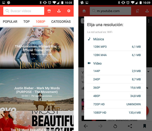 Con buen diseño y sencilla, como podéis ver en la imagen inferior, tiene 2 pestañas una para buscar en YouTube y otra para ver los vídeos que ya hemos descargado, podremos bajar el vídeo en distintas calidades e incluso si nos interesa solo la pista de audio. ¿Buena idea no?