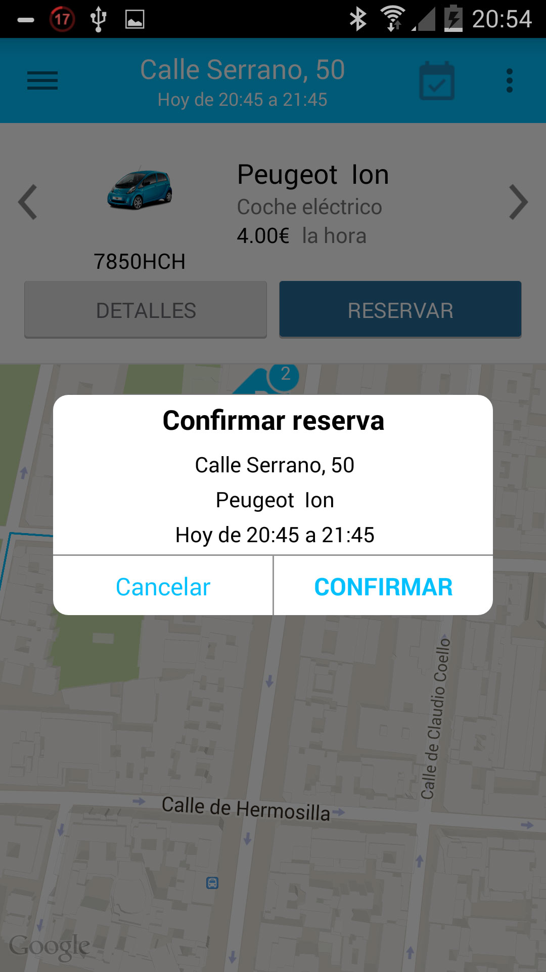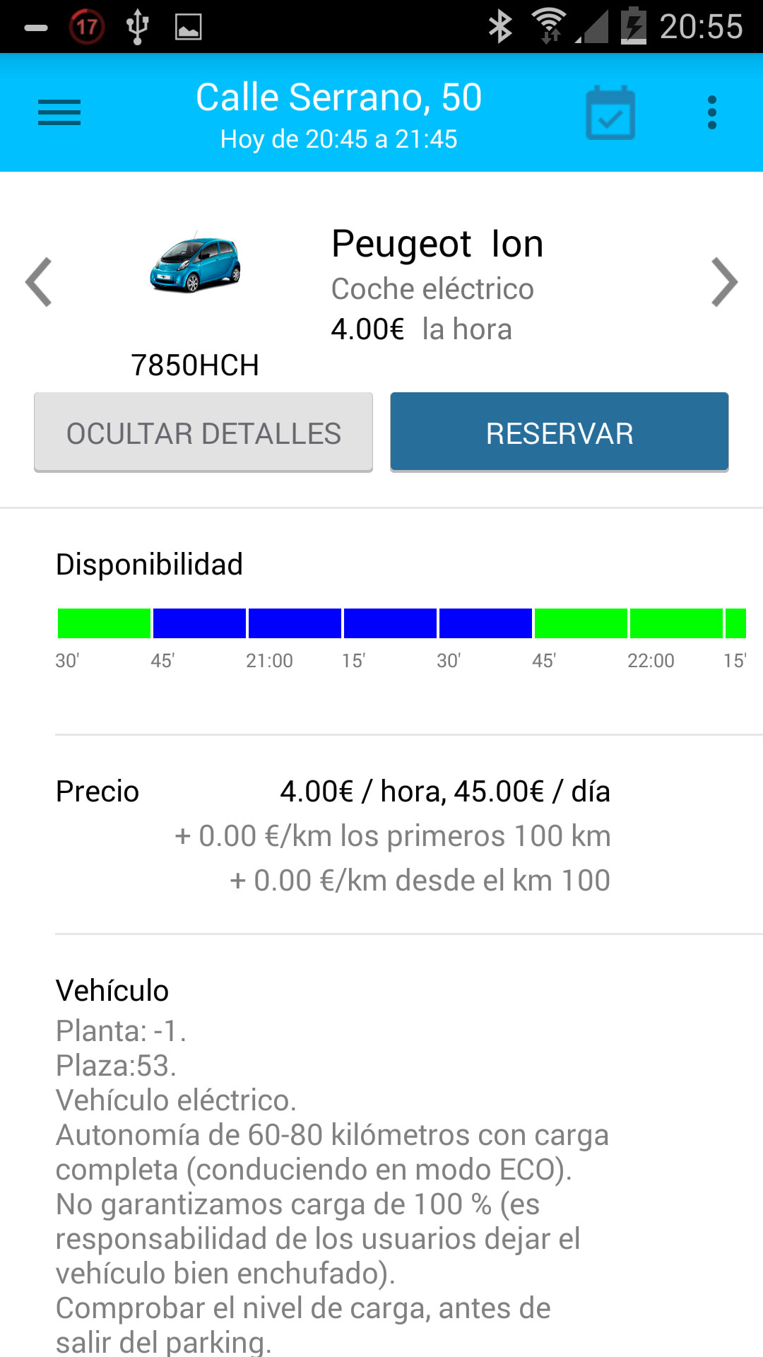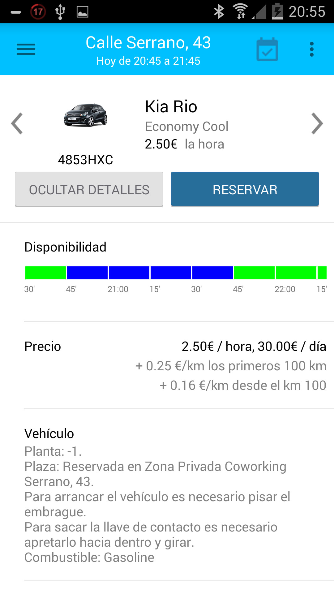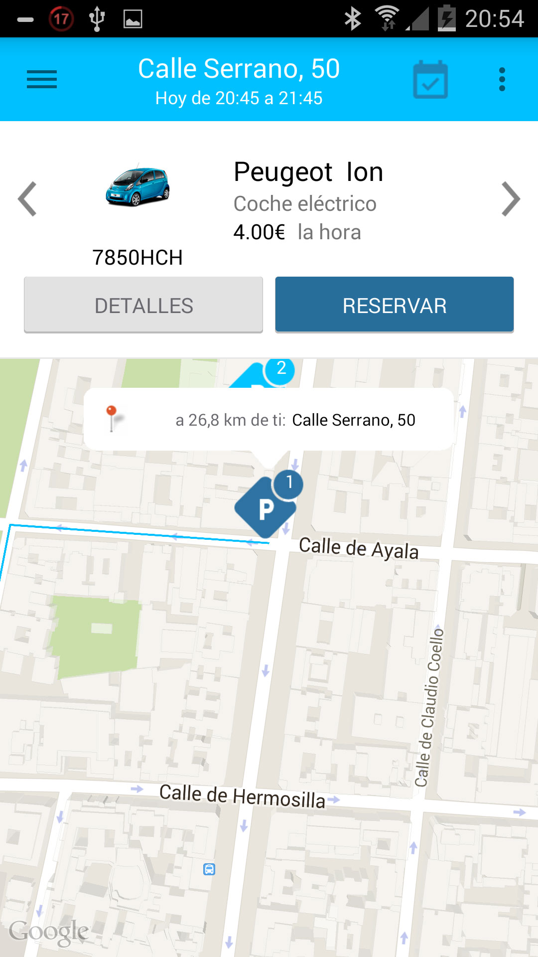 Una vez encontremos un aparcamiento con coches disponibles en nuestra zona, podremos ver los coches que tiene en su interior y seleccionar uno.