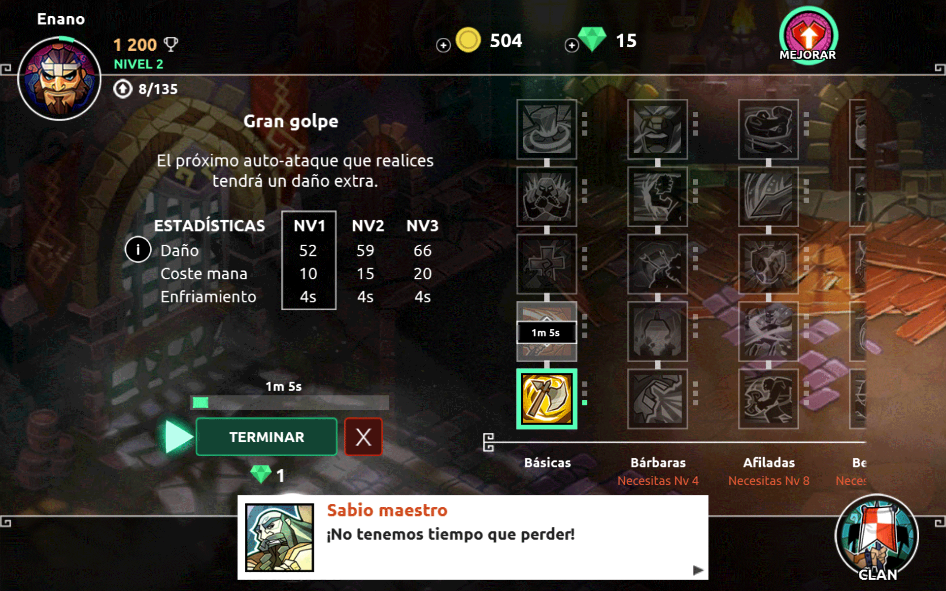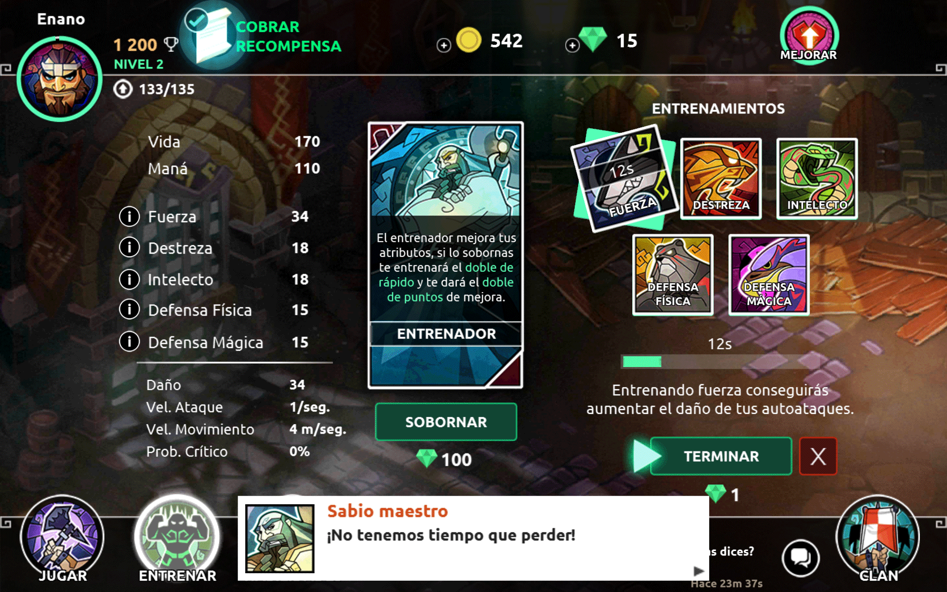 A lo largo del juego, conseguiremos armas, si pulsamos sobre el objeto, podremos ver sus características y para equiparlo, lo arrastraremos a su lugar correspondiente. También tenemos las habilidades, tendremos que investigarlas, para poder usarlas en combate. Otra cosa que podemos hacer, es entrenar a nuestro enano como nosotros queramos, podremos mejorar la fuerza, la destreza, el intelecto, la defensa física o la defensa mágica.
