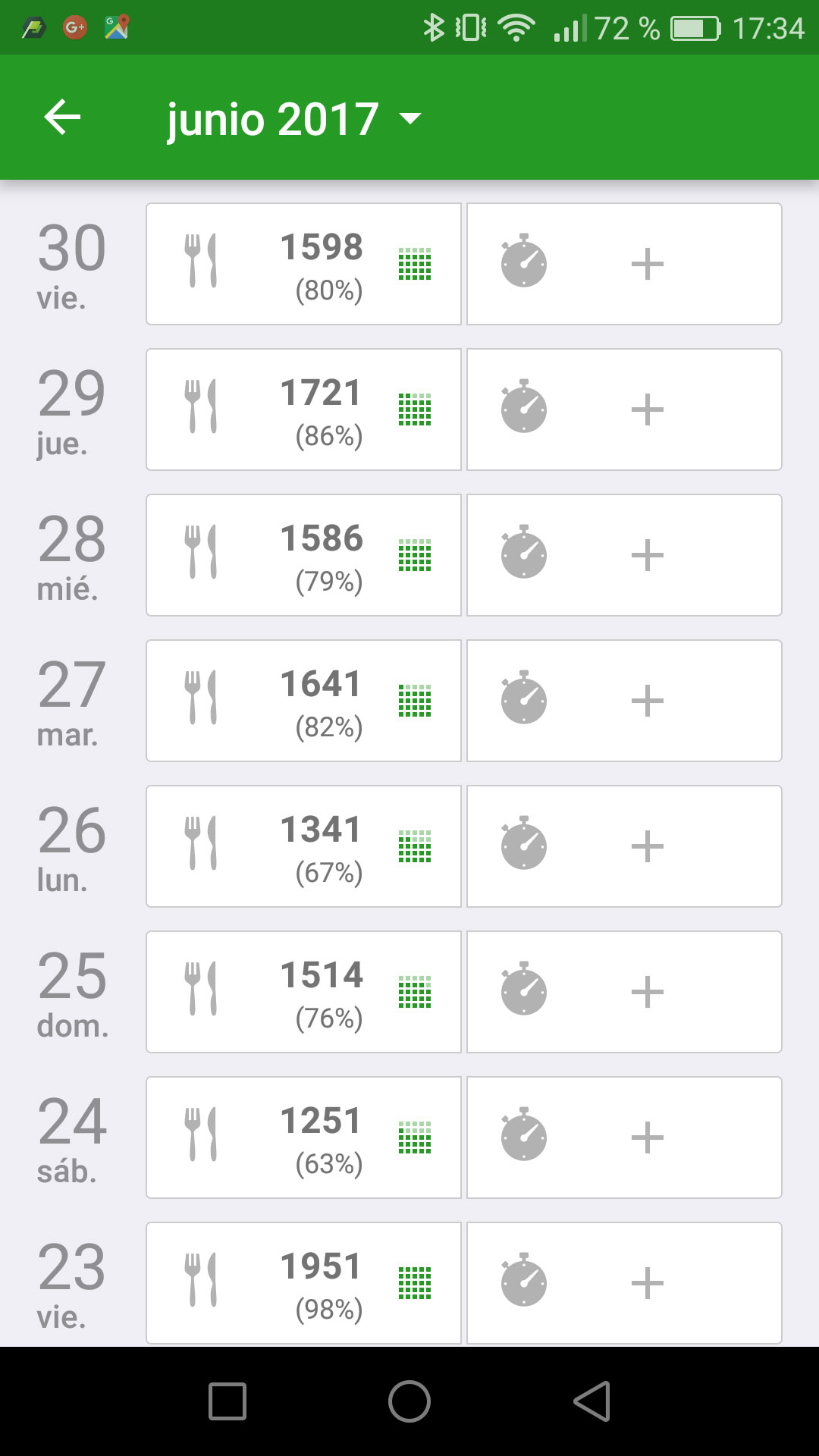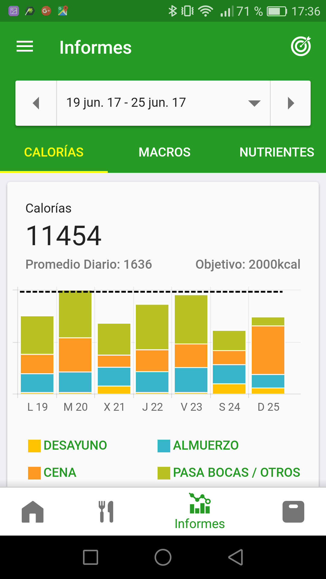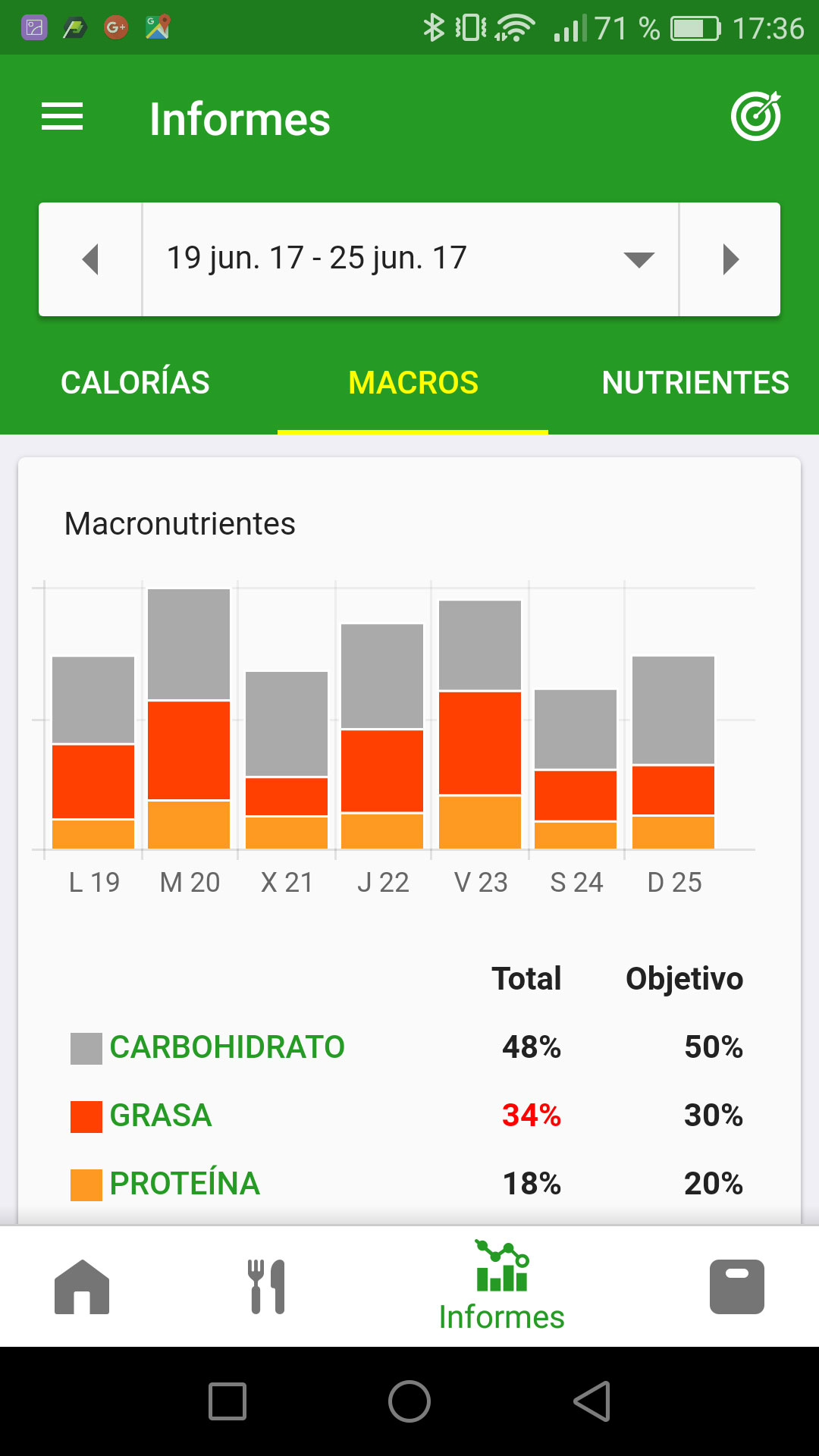 • Macros: Como en la vista anterior de un solo vistazo podemos ver que tipo de nutrientes tiene nuestra dieta, compararlo con nuestro objetivo y ver en donde debemos hacer más hincapié, en mi caso concreto suelo pasarme al comer grasas y me quedo corto de proteínas, lo cual si investigamos un poco podemos ver que dificulta bastante el perder peso.