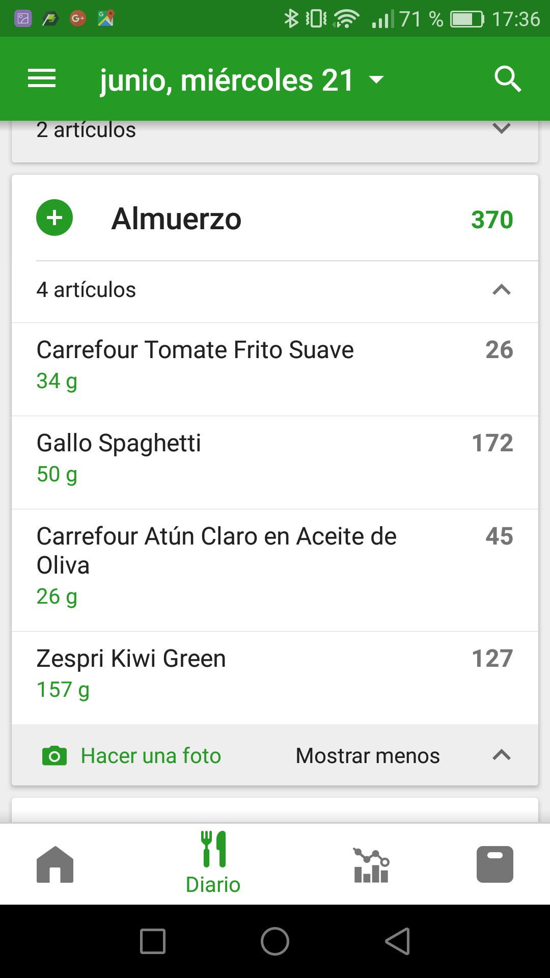 • Contador de calorías: En donde anotaremos todo lo que consumamos, y sus cantidades, ello nos dará la cantidad de calorías que conlleva ese alimento, nos proporcionara el total que llevamos consumido, y calculara la diferencia respecto a nuestro límite de calorías.