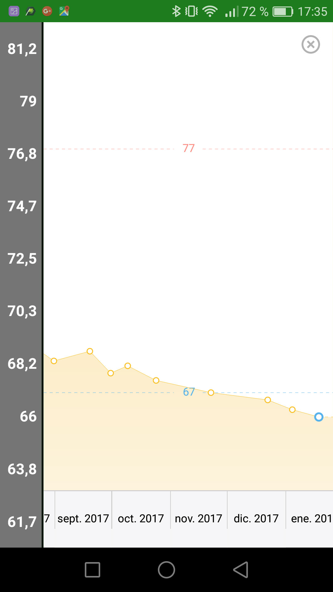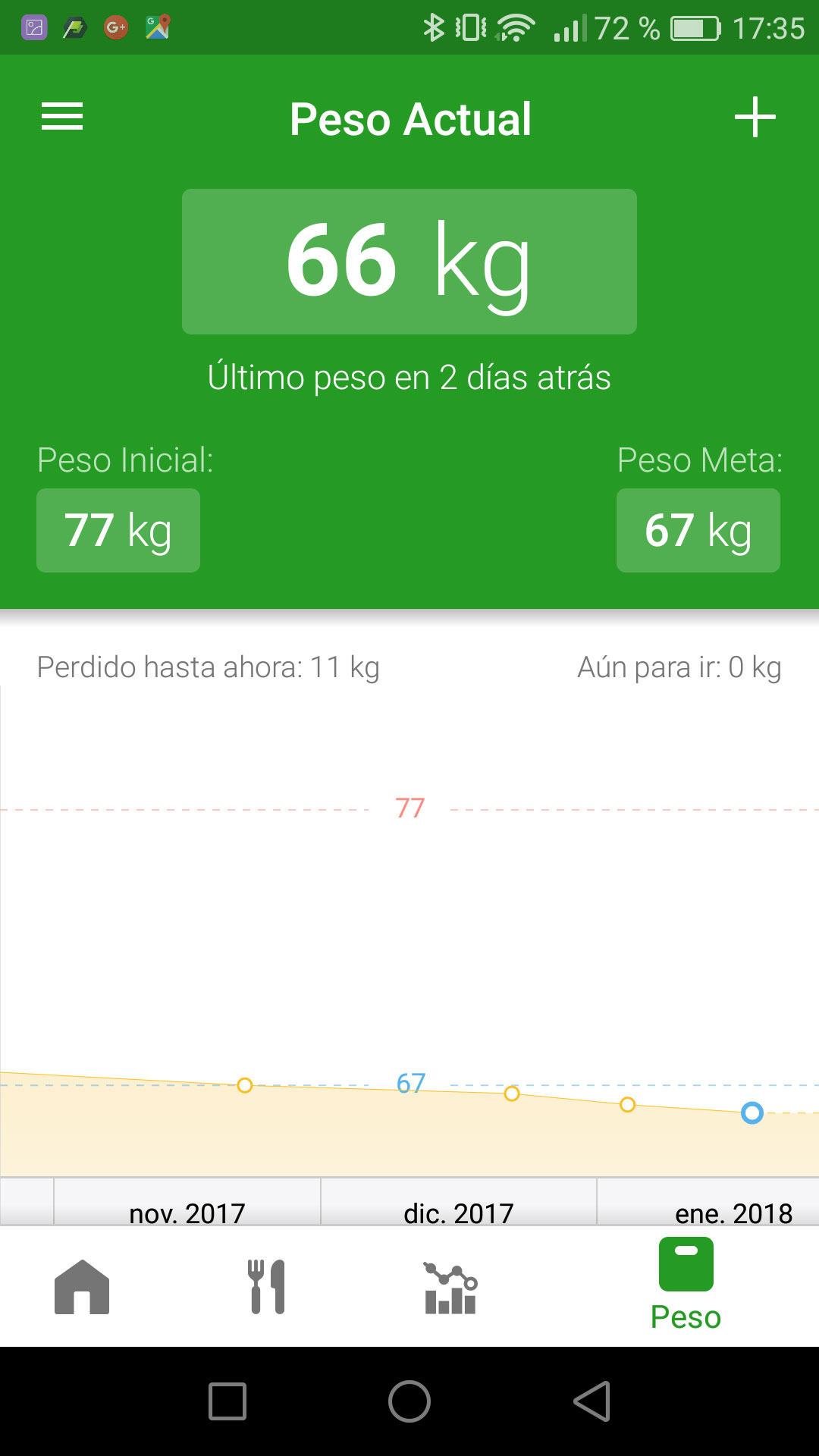 • Peso: Aquí definiremos nuestro peso y el objetivo planteado, mediante una gráfica podemos ver a que nivel perdemos, o ganamos peso.