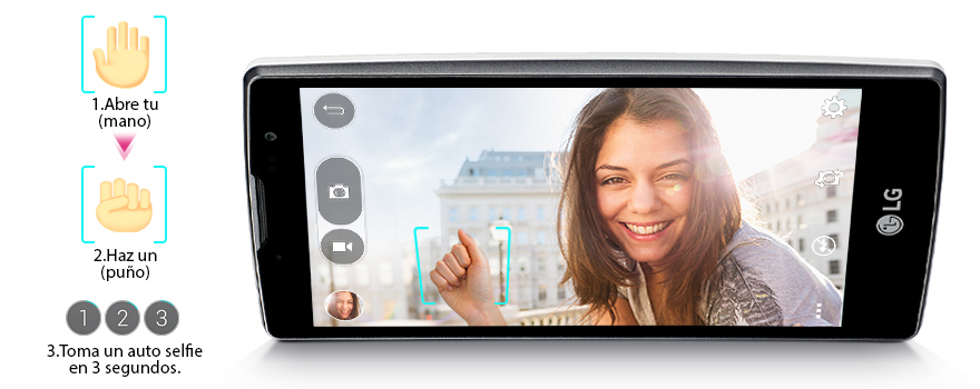 Otra de las características especiales que incorpora es su función Gesture Shot, con la cual mediante un pequeño gesto (cerrar el puño frente a la cámara) activaremos el autodisparador, y nos podremos hacer un selfie en 3 segundos, aunque si lo preferimos también podremos realizar una foto simplemente tocando en cualquier lugar de la pantalla, otra de las novedades es su flash virtual para selfies, con el que se nos iluminará la pantalla, para así proporcionar mas luz y realizar mejores fotos con la cámara delantera.