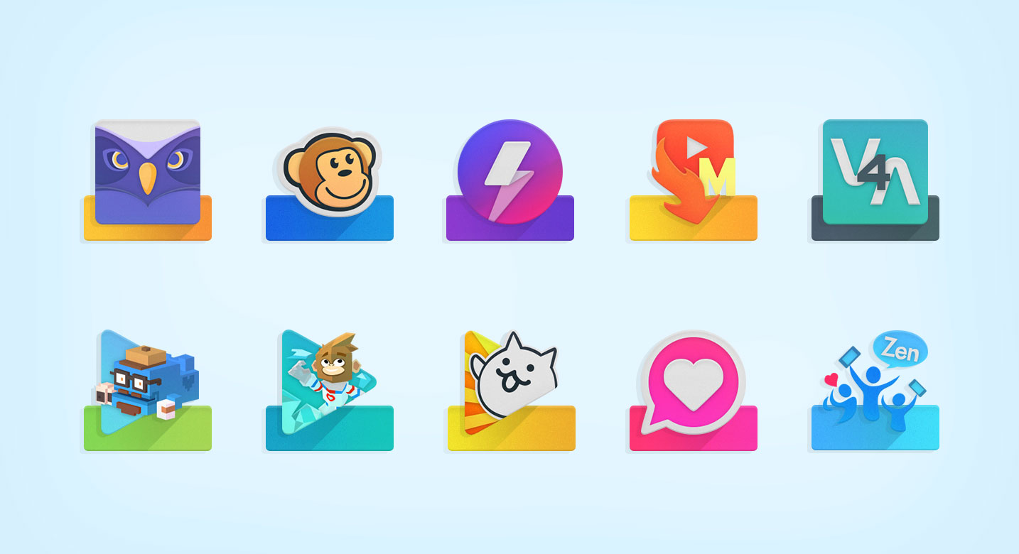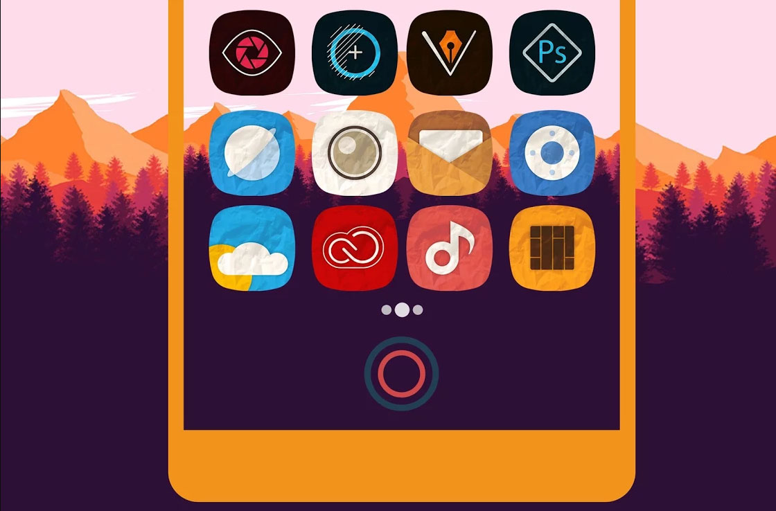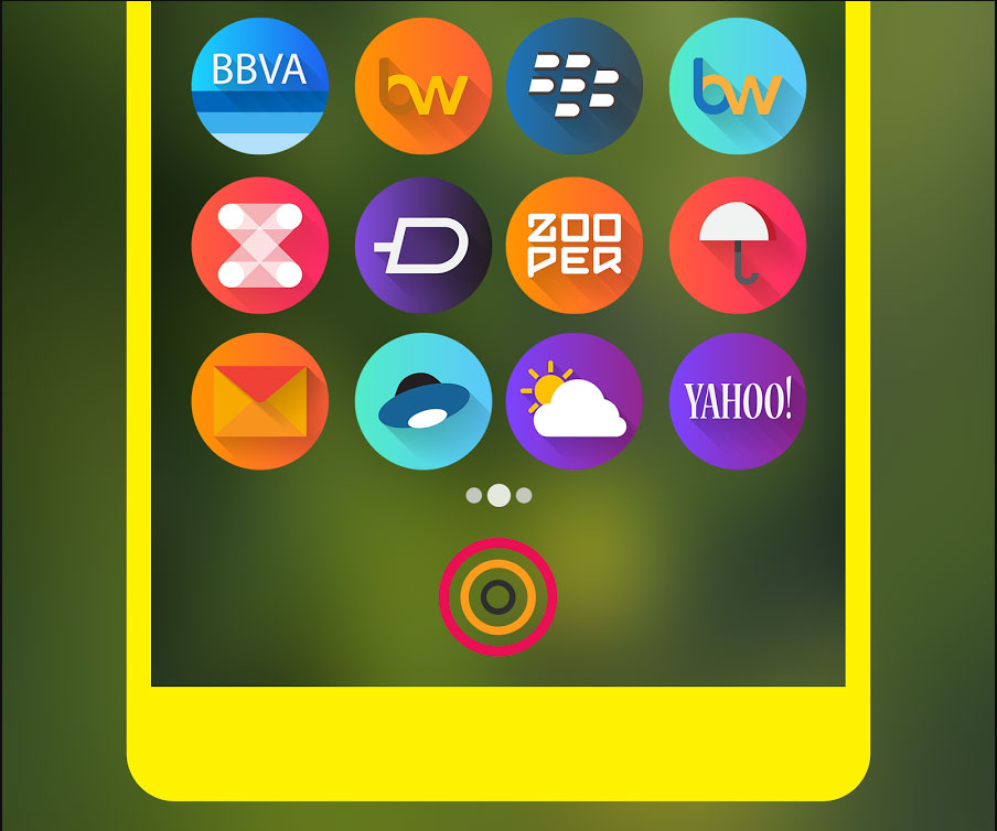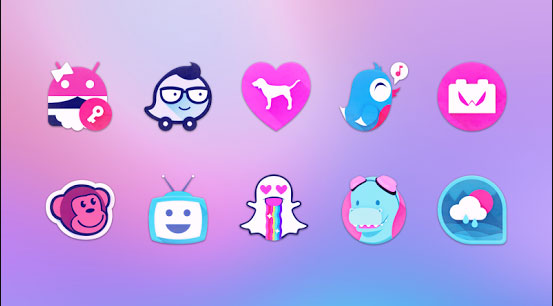 Una mezcla mágica de colores púrpura, rosa y azul con un toque de verde azulado sobre la iconografía uniforme diseñado, cientos de fondos de pantalla incluido, con el apoyo de todos los lanzadores populares.