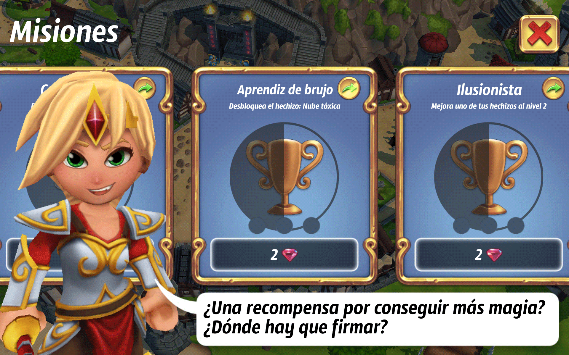 Tenemos las misiones, que al superarlas, nos darán diamantes, simplemente, por ejemplo; desbloqueando nuevas unidades o hechizos, recibiremos las recompensas.