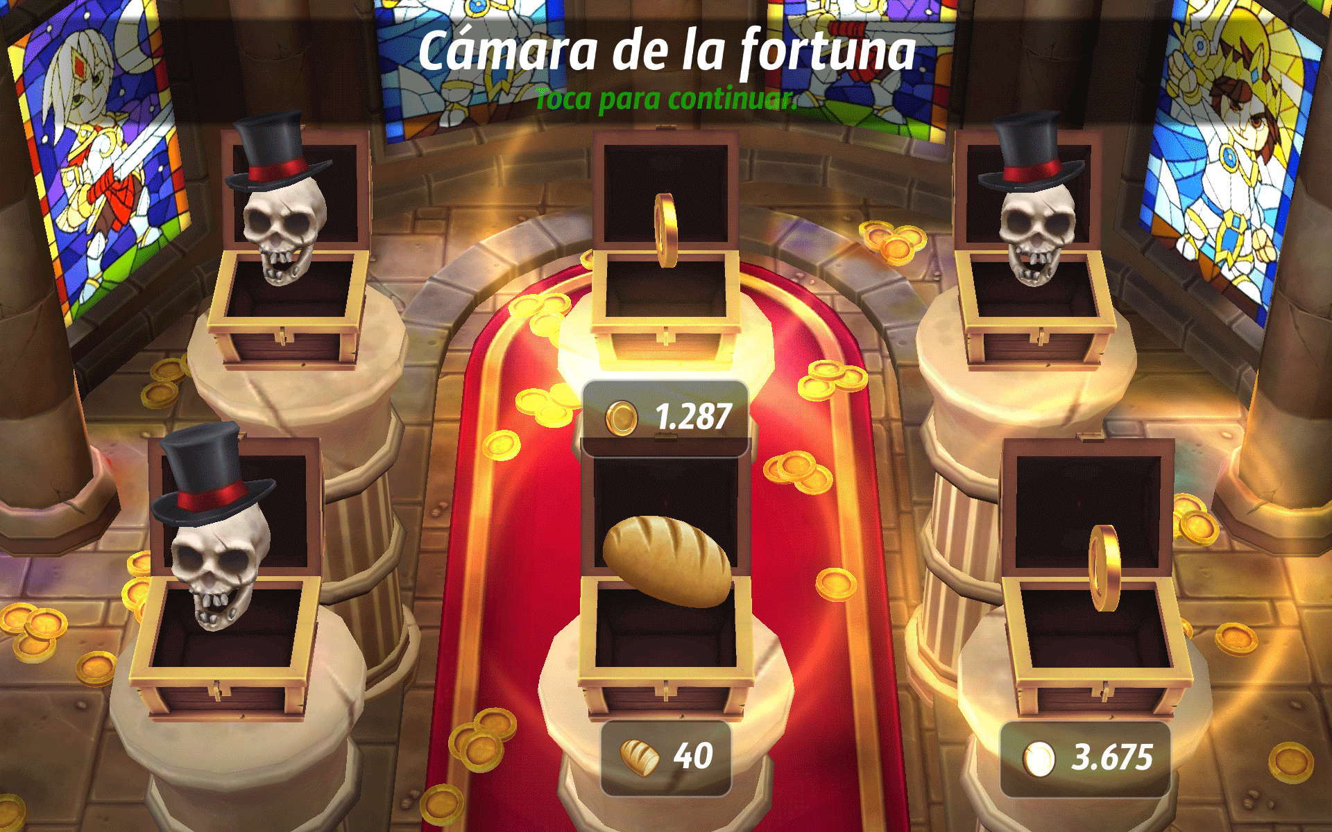 Al terminar las conquistas, nos aparecerá la Cámara de la Fortuna, aquí tenemos 6 cofres, que sí encontramos los 3 correctos, recibiremos recompensas, si fallamos uno, nos saldrá una calavera y no recibiremos ninguna recompensa.