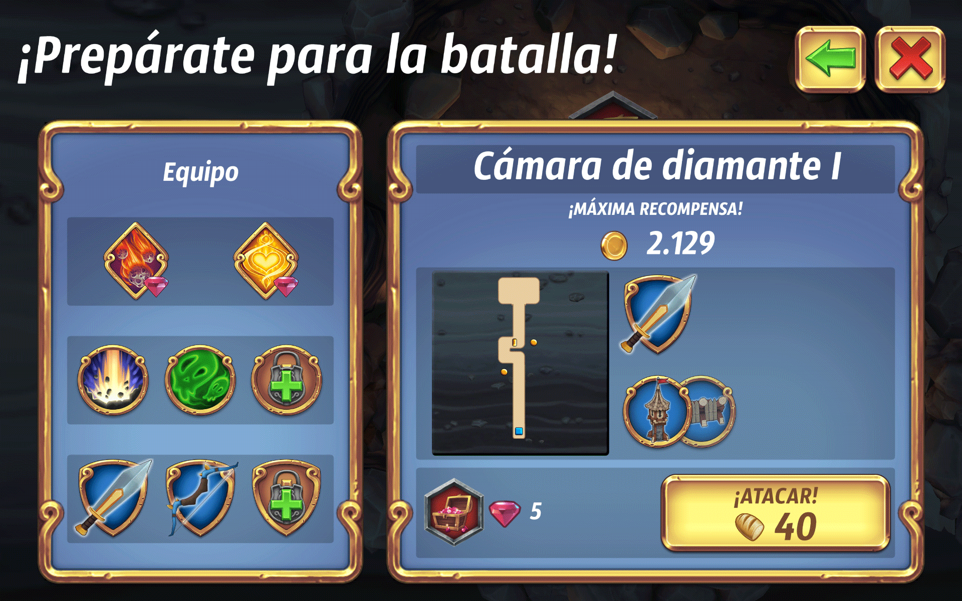 Antes de comenzar la primera batalla, tenemos que equiparnos un pergamino ( al utilizarlo, consumirás diamantes ), un hechizo y por supuesto nuestras unidades.