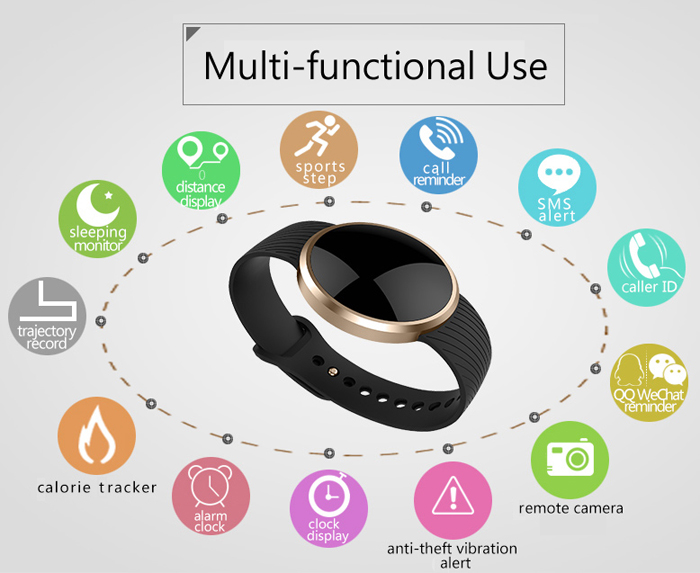 Lo tenemos en blanco o negro, con conexión Bluetooth 4.0, pantalla capacitiva circular OLED de 0.66″ y una resolución de 64 x 68px, te permitirá sacar fotos desde tu móvil pero controlandolo en tu muñeca, ideal para sacar Selfies con la cámara trasera de tu teléfono que normalmente tiene mas calidad, también tiene servicio antiperdida, lo que quiere decir que empezara a vibrar si te alejas demasiado de tu teléfono, cuenta las calorías consumidas, te avisa de las notificaciones, llamadas y mensajes recibidos además de tener alarma inteligente, con una batería que dura hasta 1 mes.