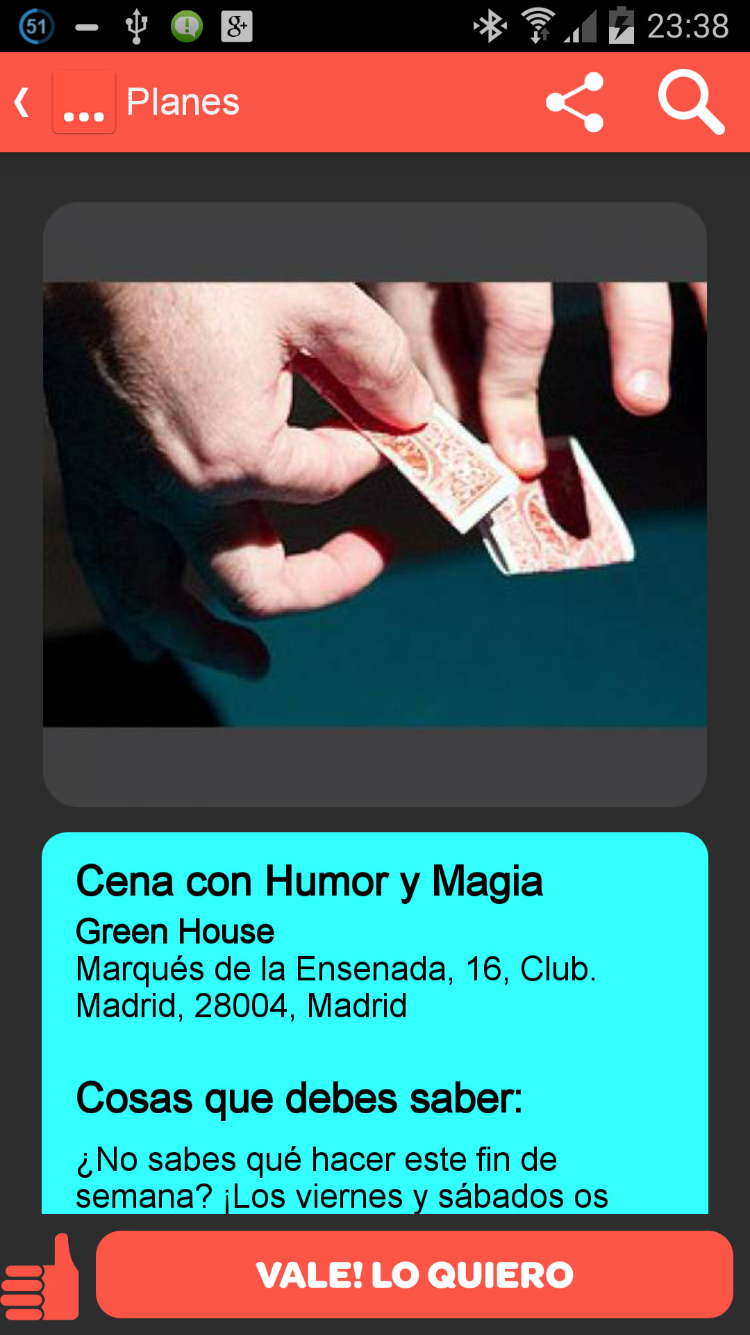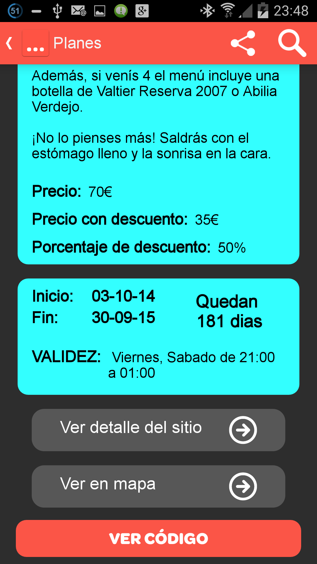 El punto a favor sin duda de esta app frente a otras como Fever, Groupalia, etc de las que ya hablamos aquí, es que puedes apuntarte a un plan sin pagar nada, y ya cuando vallas al establecimiento pagas lo que corresponda aprovechándote del descuento, en las demás app´s debemos pagar primero con el descuento y luego ir al establecimiento, lo cual esta genial, por que lo disfrutas sin preocuparte de llevar ni siquiera dinero, pero y si surge algo y no puedes ir en las fechas acordadas? habrás perdido tu dinero, esto con Whats Red no ocurre.