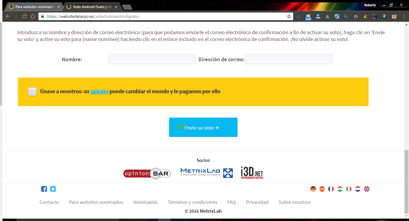 - Rellena tu Nombre y una dirección de email valida (Tendrás que confirmarlo después), y dale al botón de enviar voto, no hace falta que marques la casilla, si lo haces te mandaran emails para que rellenes encuestas a cambio de dinero, ya depende de cada uno, pero para votar no es necesario.
